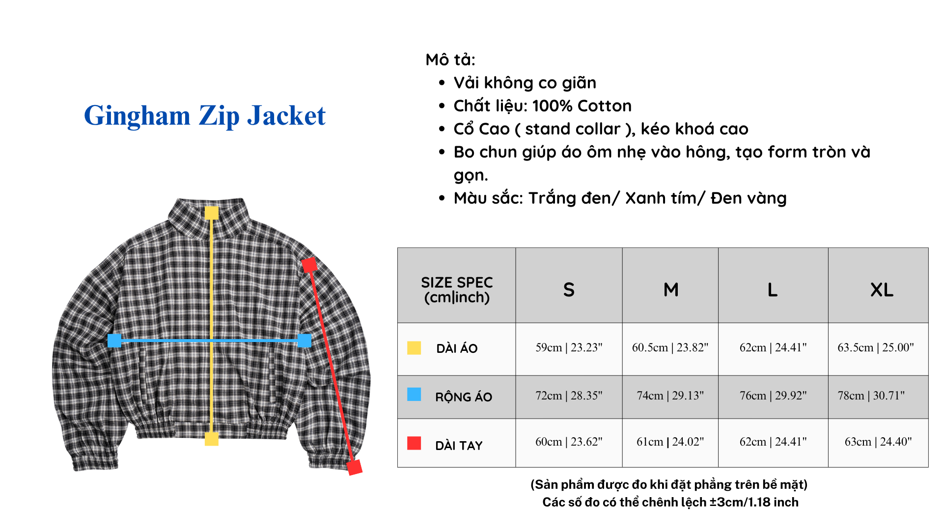 Gingham Zip Jacket nổi bật với form dáng boxy cứng cáp, được may từ 100% cotton không co giãn. Thiết kế cổ cao có khóa kéo, kết hợp cùng lớp lót lưới mè thoáng khí, tạo nên một chiếc áo khoác vừa phong cách vừa tiện dụng.