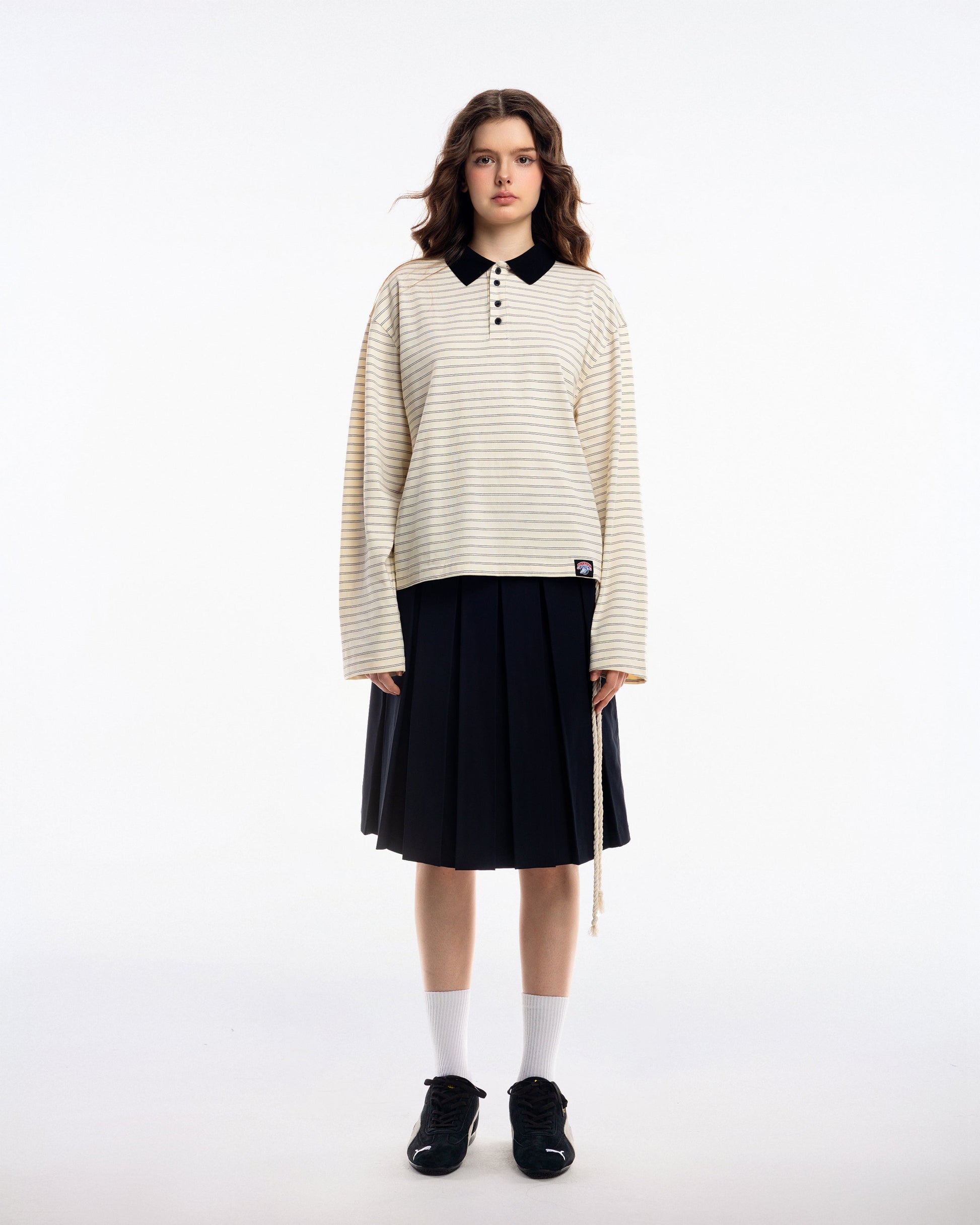 - Chi tiết: Cổ bo dệt màu đen tương phản, nút đen, tag trang trí ở lai áo