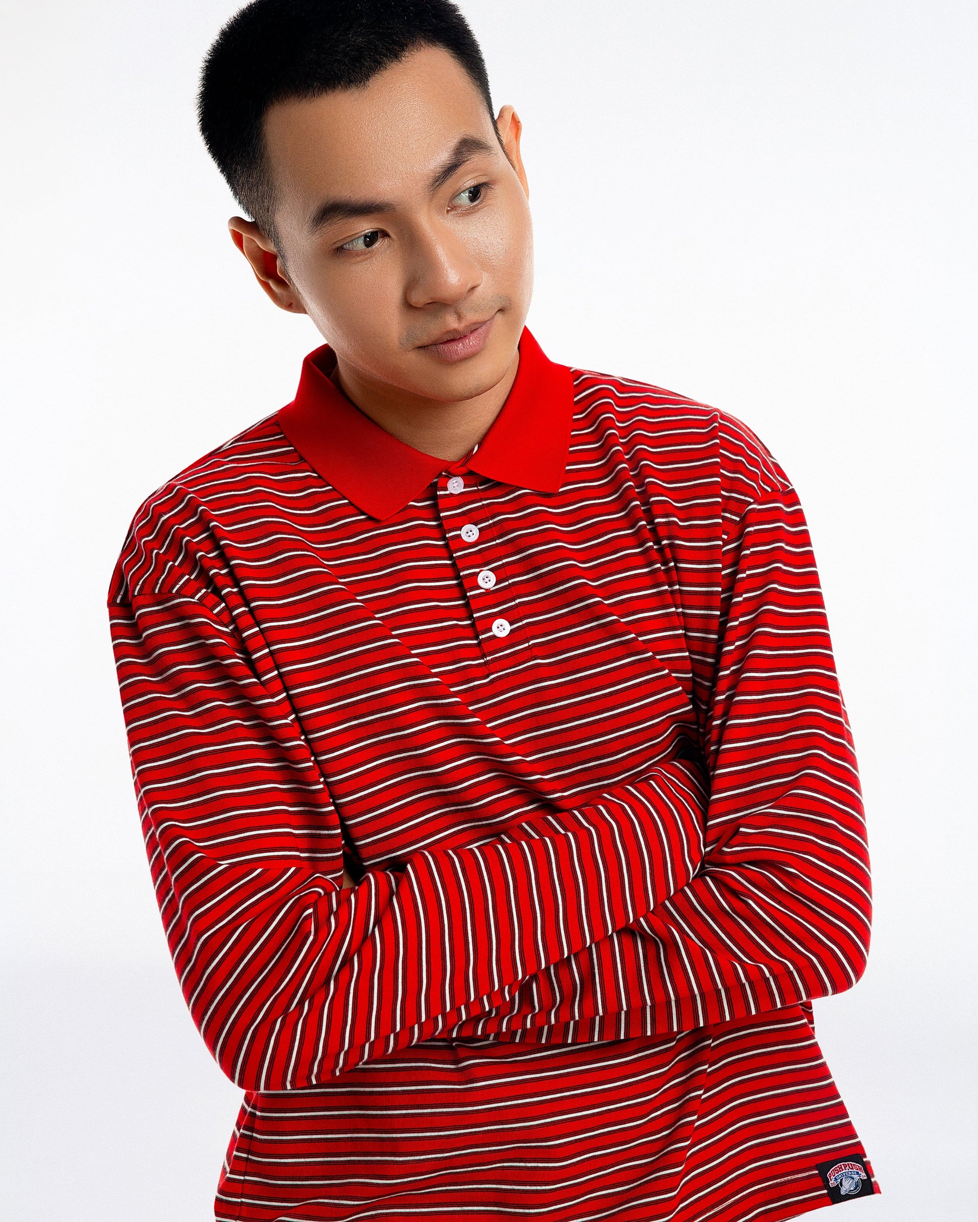 Mẫu polo ấn tượng trong form boxy đương đại. Thân áo màu đỏ nổi bật và cổ bo dệt cùng màu, tạo tương phản sắc sảo với hàng nút màu đen, mang đến vẻ ngoài thu hút.