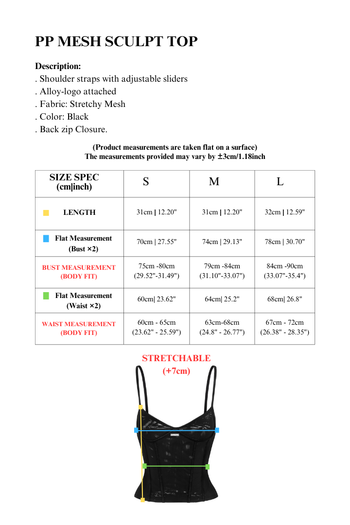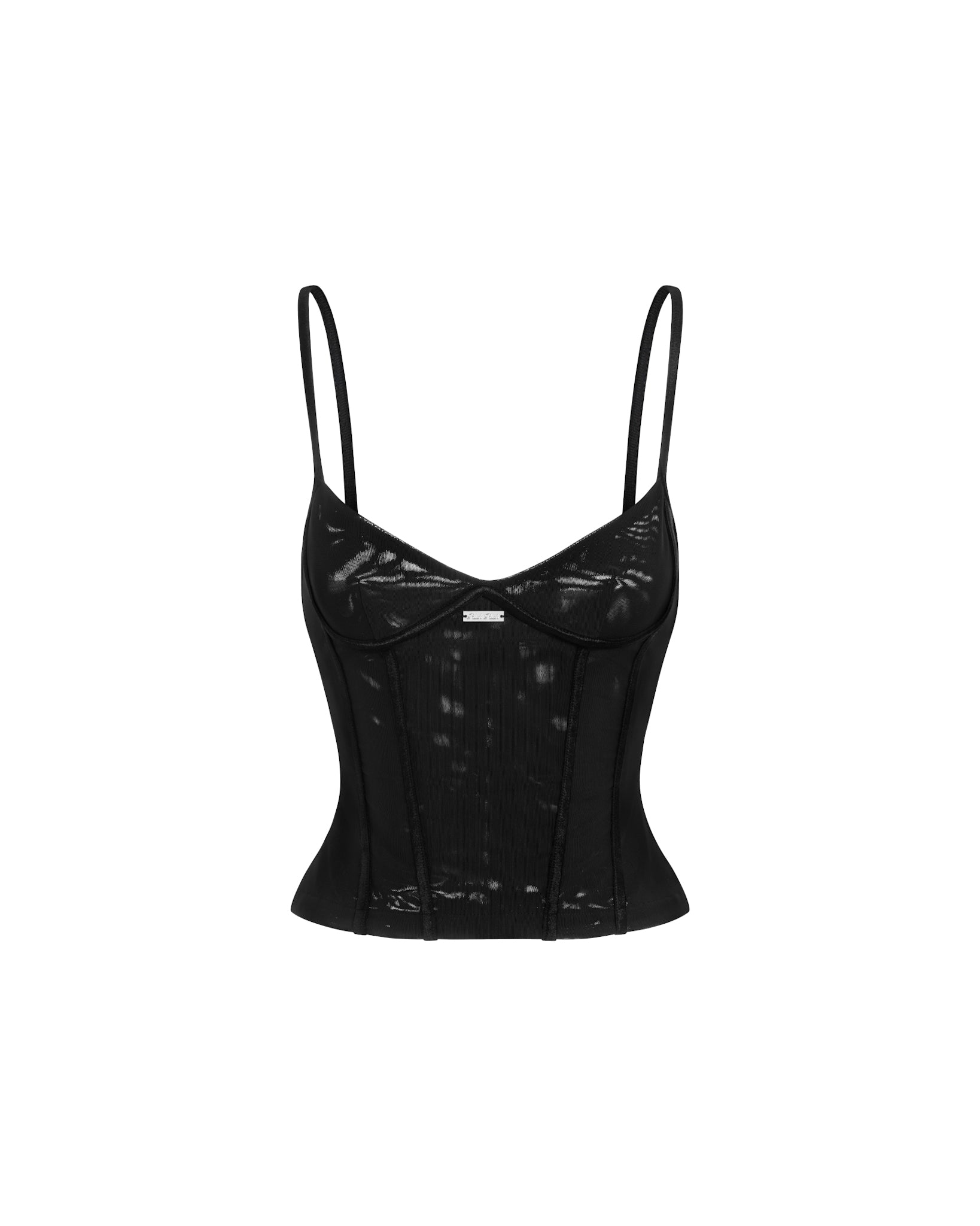 Áo tank top lấy cảm hứng từ corset, được thiết kế ôm dáng với chất liệu lưới co giãn 4 chiều, gồm 3 lớp tạo hiệu ứng tôn dáng với độ xuyên thấu nhẹ. Phần thân áo được chia mảng theo đường may dọc giúp tôn lên vòng eo. Khóa kéo giấu kín phía sau giúp dễ dàng mặc vào. Điểm nhấn là bảng logo kim loại hợp kim ở ngực, tạo cảm giác cao cấp và nổi bật.
